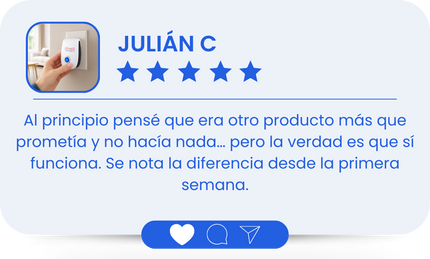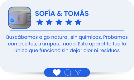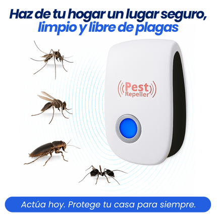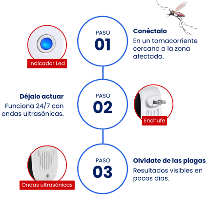 Su tecnología ultrasónica actúa de forma continua para ahuyentar cucarachas, mosquitos, y más, sin poner en riesgo a tu familia ni contaminar tu hogar. Solo conéctalo y disfruta de un ambiente limpio, seguro y libre de plagas... todos los días, sin esfuerzo.