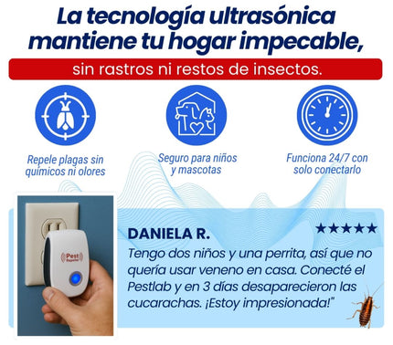 Pestlab utiliza ondas ultrasónicas inteligentes que alteran el sistema sensorial de plagas, forzándolas a irse sin químicos ni riesgos.