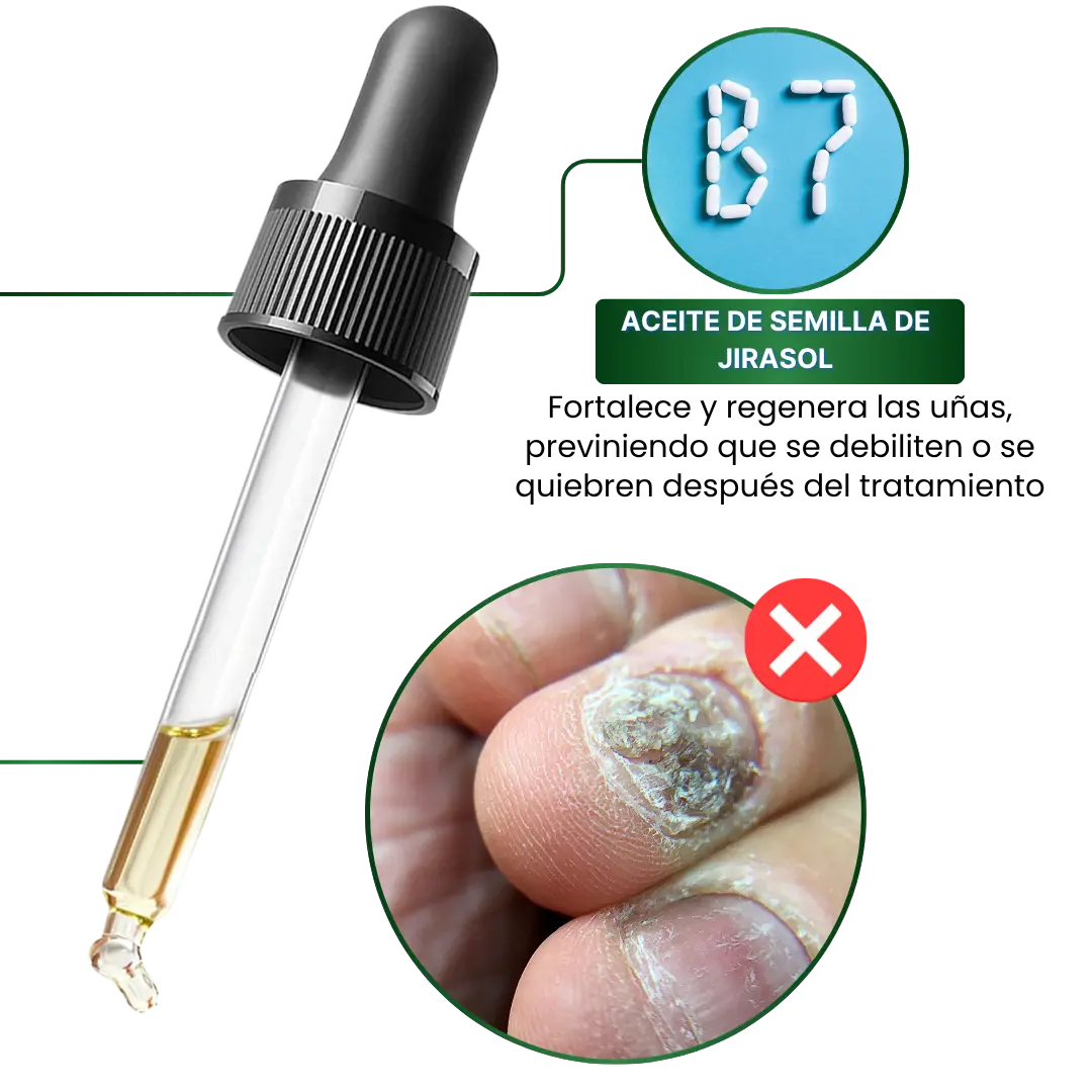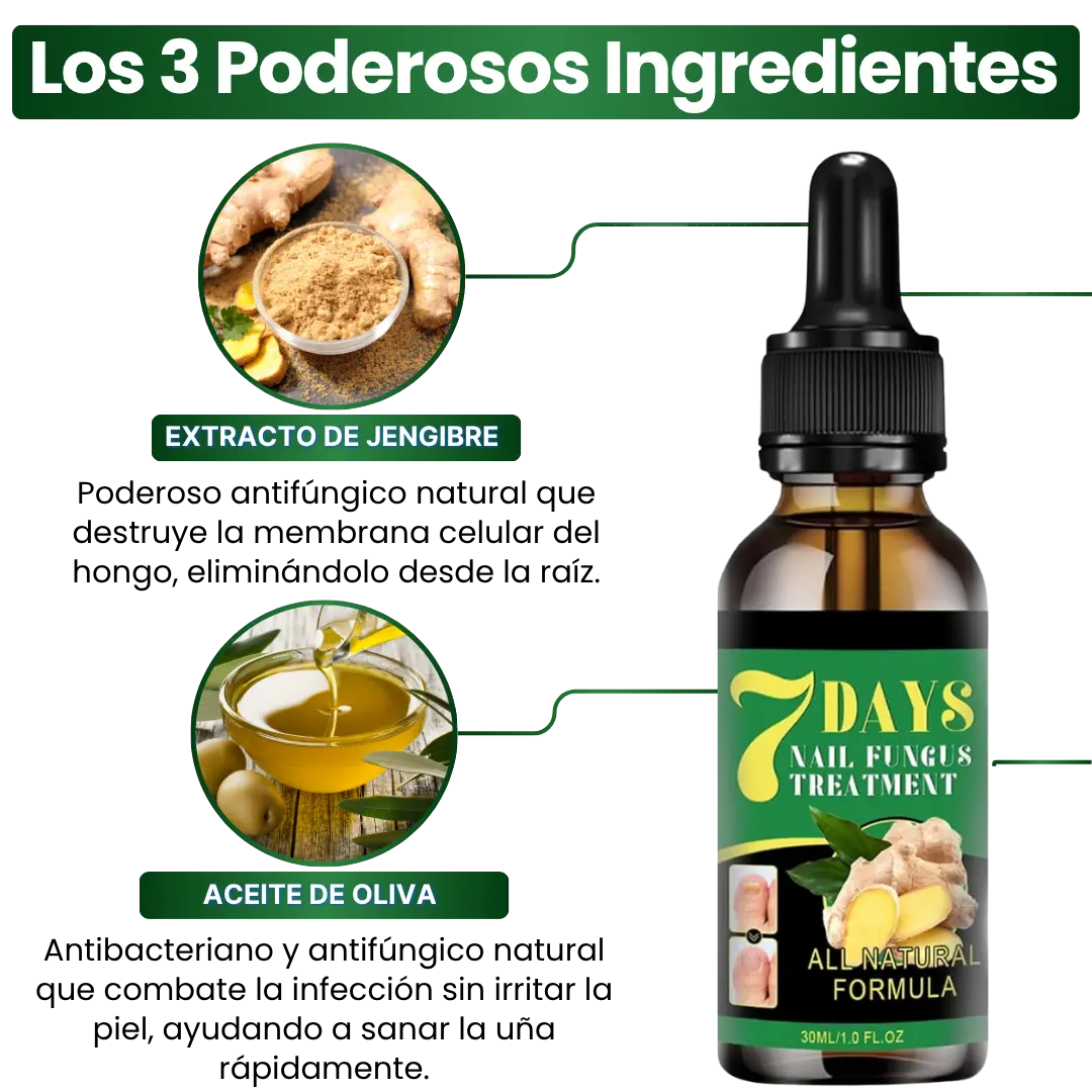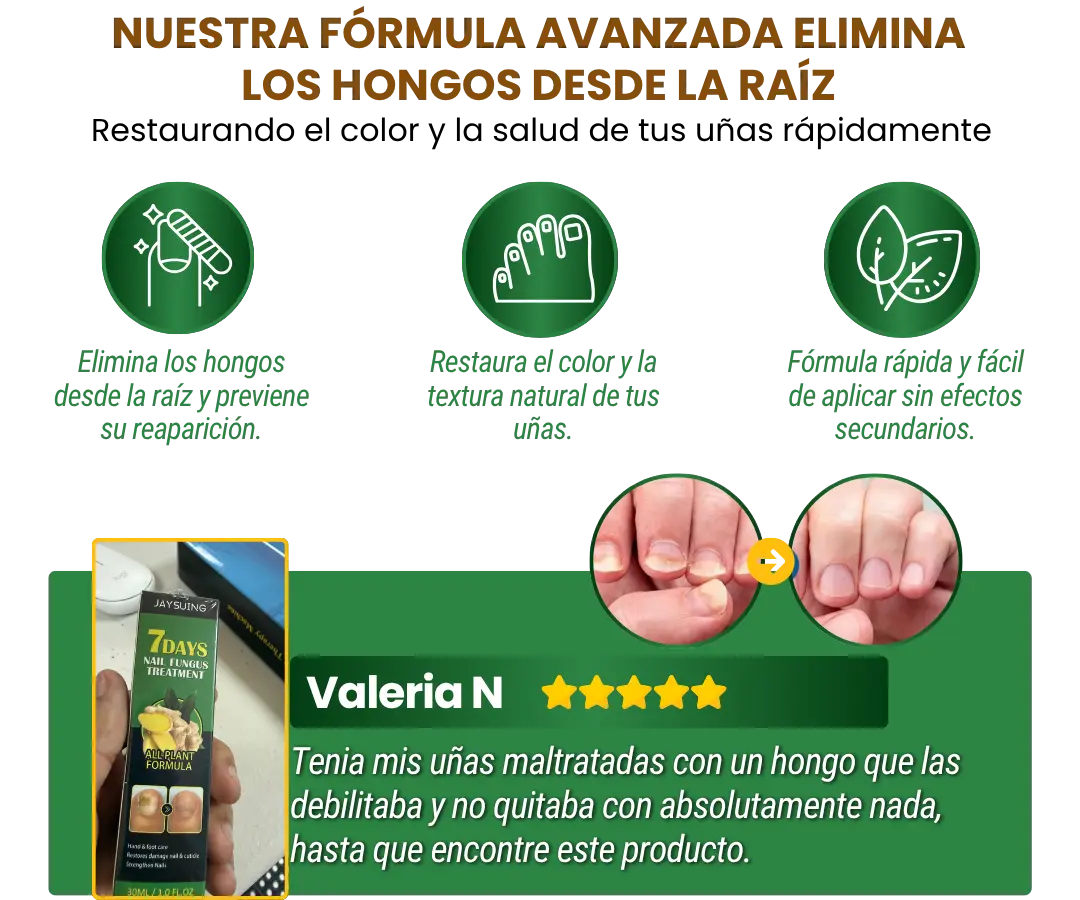 Contiene una fórmula avanzada con ingredientes naturales que eliminan los hongos desde la raíz, restauran el color natural de las uñas y previenen su reaparición sin químicos agresivos.